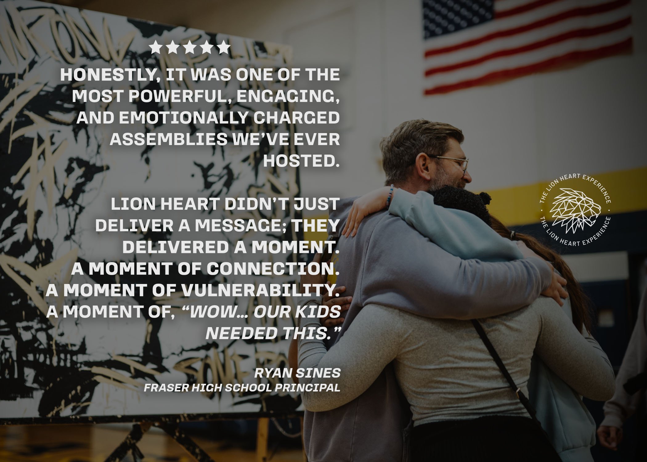 The Lion Heart Team is best known for their district-wide investments with expertly nuanced programing from Elementary, all the way through High School. This offers a unique and comprehensive experience for districts to feel a surge of positive messaging to compliment the school’s established efforts around mental-health.